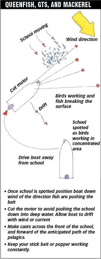 Large poppers are the most user-friendly option if you intend to target them off the surface, as they are easy to cast, simple to retrieve, and perfectly replicate a fleeing baitfish. It is just a matter of casting out and working the popper violently back to the boat. Strategically cutting the outboard before the school is spooked and goes down will take some time on the water. The best option is to anticipate the path of the school and cut the motor forward of where the school is heading.
