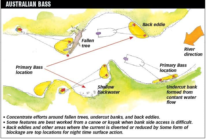 The bulk of my bass fishing is undertaken in rivers and creeks so we will look at the key areas to subdue fish in these environments. Undercut banks, back eddies and fallen trees are possibly the primary areas to find bass. These areas are particularly productive during daylight hours, however casts must be accurate and within half a metre of that feature if you want to generate a strike. As the sun dips down and the shadows lengthen, bass will move away from their daytime lair under the cover of darkness. At dusk, work areas within the direct vicinity of these features, as bass will be more alert and willing to hit a surface lure. The darker it gets, the more areas will open up for bass strikes. Deep channels or gutters running close to prominent snags as well as mid-stream boulders or trees will come into their own during the night. Any feature that will divert the current and create a sanctuary from the moving water is worth concentrating your efforts around.