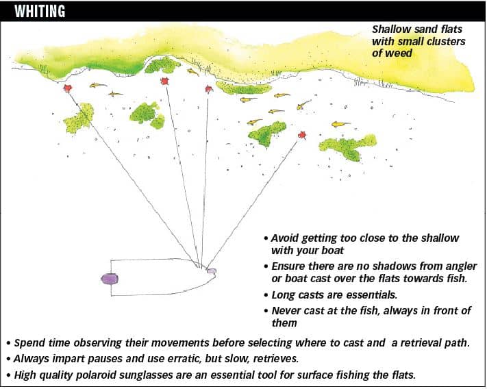 A key element of whiting on the surface quests is pinpointing the fish. Whiting are so well camouflaged that at time they are almost invisible. This is where you need to look for the moving shadows because as good as whiting are at hiding themselves, they can’t hide their shadow. ‘Casting at shadows’, as I often refer to it, often means using your powers of observation before casting. Watch the fish for a few minutes before starting to cast as it is important to get an idea of where and how the whiting are moving around.