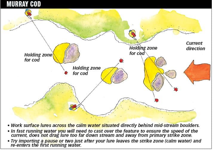 Some of the best areas to work surface lures include the edge of banks and shorelines where terrestrial life can be blown into the water. Overhanging tea trees and scrub, branches of trees and elongated canopies of eucalypts that are within close vicinity of the water’s edge are prime areas. Another proven feature to target cod in rivers and impoundments are rock formations that jut out into the main body of water. These spots offer ideal launch pads to nail any prey moving past.