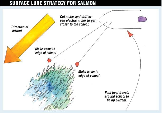 There is a misconception that once you find some fish that the rest will pretty much take care of itself. I have seen big schools of salmon going berserk on the surface only to see a boat power right up on top of them and put the school down. On other occasions, even with a slow, smooth approach, you can’t get to within casting range under the power of a petrol motor without spooking the school.