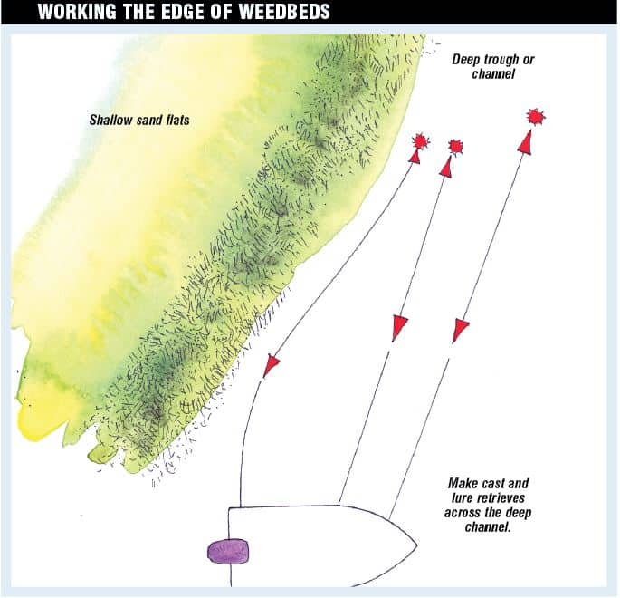 Another good area to search for salmon on the surface are acute or sharp bends in the waterway. If there is deep water nearby or adjacent to the bend then this area is more likely to attract fish. The reason bends are so good is that there will be back eddies and holes or troughs gouged out thanks to the current. These areas, particularly back eddies, will allow schools of salmon to hold and attack passing baitfish as they move with the current. The deeper holes will attract and hold the baitfish that will seek refuge from the powerful current, which may be too strong for the fish to swim against. The final area that is worth prospecting around is weed beds close to deep troughs that run parallel to the weed. If the bottom of the trough or channel is made up of partly broken reef and shell beds then you will have the added bonus of by-catch such as bream, whiting, and flathead.