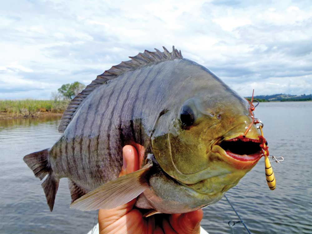 I fired a cast up onto the bank and slowly twitched the lure back into the muddy water. When it was about 2 m from the edge, in about 1.5 ft of water, a bow wave raced towards it and stopped directly in front of the lure. I wasn’t sure what to do so I froze, then gave the lure a couple of small twitches. I felt a clunk as the fish crunched down hard on the small soft plastic lure, sending a powerful flick through my line and down my rod. I set the hook.