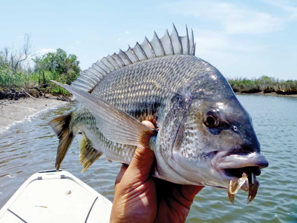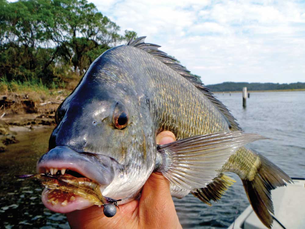 As the morning progressed the fish appeared to move off the flats and so at this stage I moved to fish some deeper water along a rock wall. I tied on a small soft plastic worm rigged on a three gram ball jighead. The idea was to set up a drift parallel to the rock wall and fish my plastic along the line where the rocks met the mud in about 3.5 m of water. I proceeded by casting my lure as far as I could directly in front of me. I waited for it to hit bottom and then gave the rod tip several erratic twitches between long pauses, to bring the worm to life. It didn’t take long before I had my first touch, then my first bream on board in this new location, then a second and a third.