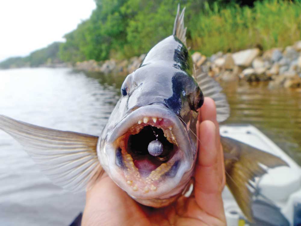 The fish were relatively small and amidst all of the action I happened to glance at my depth sounder and noticed some solid arches hanging close to the bottom. I now wanted a lure that would get down quickly, past the feeding frenzy that was happening mid-water and down to the bottom. So on went a vibe. I employed the same technique as I did when using the soft plastic worm, casting tight against the edge of the rocks and the mud, only this time I gave the vibe two small hops along the bottom between pauses. I hooked up on the first cast and line started peeling off the reel, then nothing. I mustn’t have hooked him properly. Not to worry as the next cast also got hit by a very solid fish and after an exciting fight up came a big, fat healthy black bream.