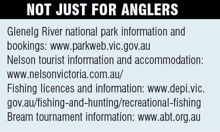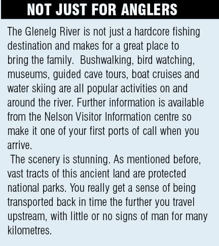 Accommodation options are many and varied, ranging from camping in the Lower Glenelg and Glenelg National Parks right through to luxury holiday homes in and around Nelson. Always book ahead as the region is a very popular destination, especially around peak holiday periods. There are also several fishing tournaments held on the river so expect an increase in boat traffic when these events roll into town. With that in mind, there are eight good boat ramps between the estuary at Nelson and Sapling creek upstream, so there is always somewhere to get away from the crowds. If you don’t want to bring your own boat but still want to get on the water, you can hire motor boats, canoes and kayaks from Nelson. The town also has a great pub (an excellent place to find out what’s biting and where), takeaway food, fuel and ice. I have provided some useful links at the end of this article to help with your research and planning.