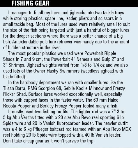 The urge to cast at all likely areas and getting our fair share of snags saw Jason and I lagging behind the three other boats in the afternoon. We had lost sight of them in the winding river for over an hour but as we rounded a tight right hand bend, the three boats were pulled up at the first major obstacle.