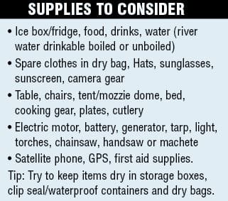 As the first rays of sun punched through the canopy of the trees, we packed up camp and readied our gear. Eight blokes laboured away to launch the four tinnies, fit electric motors and work out how best to fit in all the gear needed for the next five days. Camping gear, table, chairs, clothes, cooking gear, fridges, eskies, generator, chainsaw, food and drinks all had to be carried the 70-odd kilometres down the river to Stones Crossing in the small tinnies. Once packed, it was just a matter of finding somewhere to sit and plonk the most essential items – fishing rods and tackle – on top.