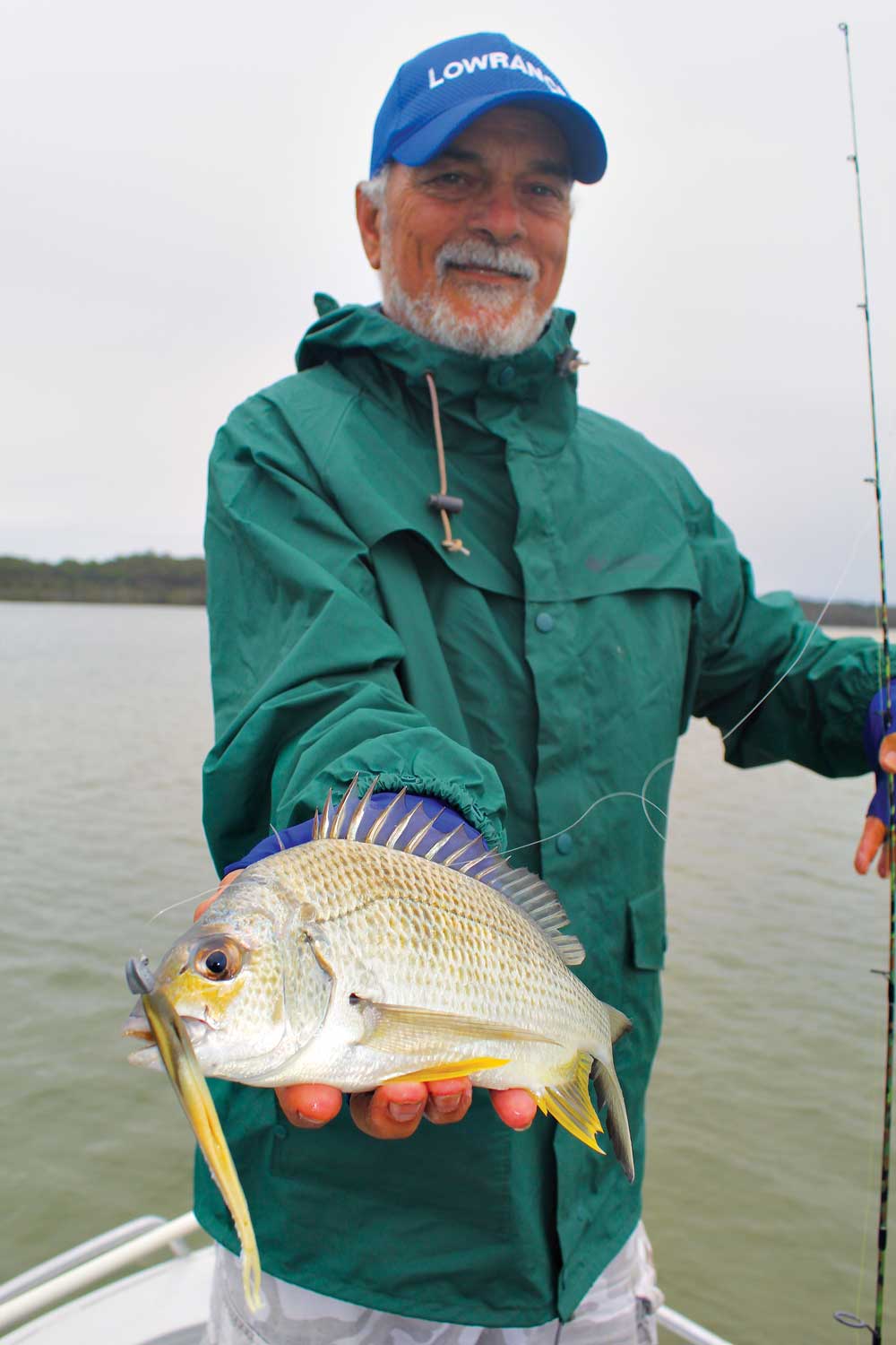 Large presentation will attract the attention of bream through winter. This lovely yellowfin fell for a 5” Berkley Jerk Shad.