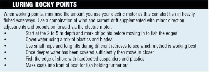Initial approach to these areas should be slow and cautious with minimal wave action from the boat. If possible, come in from up current or up wind so that the waves from your boat mix with the natural occurring swells and wave action from the wind or tide. Also pay attention to where the sun is and if any shadows from the boat or anglers will be cast over potential fish holding water. The other important factor when working points and bays is to make as long a casts as possible so that you reach areas where noise hasn’t quite affected the fish yet.