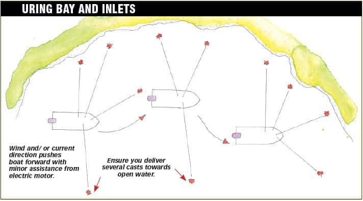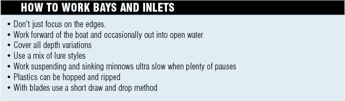Initial approach to these areas should be slow and cautious with minimal wave action from the boat. If possible, come in from up current or up wind so that the waves from your boat mix with the natural occurring swells and wave action from the wind or tide. Also pay attention to where the sun is and if any shadows from the boat or anglers will be cast over potential fish holding water. The other important factor when working points and bays is to make as long a casts as possible so that you reach areas where noise hasn’t quite affected the fish yet.