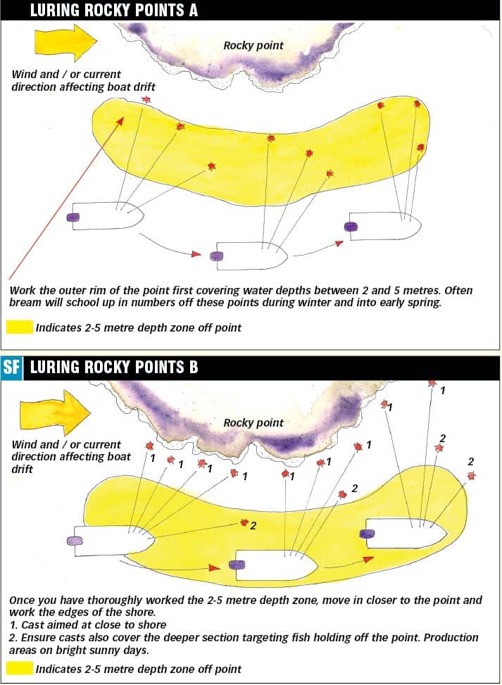 With regards to rocky points, do not discard those small clusters of rocks that seem almost obsolete and easy to dismiss. Quite often some of our best bream have been taken from these minute features. Try to minimise the use of your electric motor along these points as constant ‘clunking’ of the motor engaging or changing direction can alert wary bream to your presence.