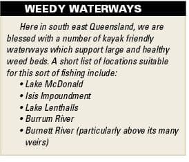 Actually, kayaks and canoes are the perfect platforms for weed bed fishing. With no motor to worry about, you can paddle right through the sort of vegetation that stops outboard powered boats in their tracks. You tend to slip right over the top of the vegetation and I never cease to be amazed at how far back into weed choked bays I can push my yak. Of course, the lack of engine noise also works in our favour. If you take it slow and carefully work your way through the weeds you can sneak right up on unsuspecting fish and make accurate, short range casts which allow you to watch the whole process unfold, and that only adds to the attraction.