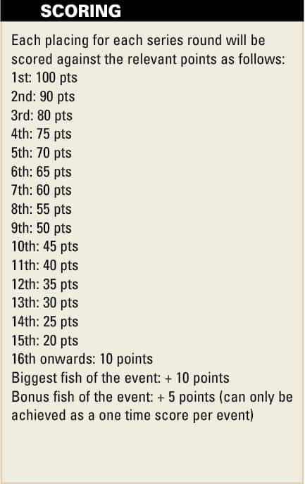 “At the days end an angler’s score for a round is calculated by combining their fish from a selected bag for a total length measure.  That gives us a ladder of kayak angler placings, with first place being assigned 100 points, second place being assigned 90 points and so on.  At that stage we add 5 bonus points if an angler has caught the secondary species, and 10 bonus points for the biggest catch of the target species for the round”.